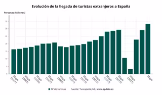 España enfila una nueva temporada turística de récord superando los 33 millones de turistas internacionales hasta mayo, lo que supone un 13,6% más que en el mismo periodo de 2023, según los datos hechos públicos este miércoles por el Instituto Nacional de Estadística (INE), que cifra en más de 43.200 millones el gasto de estos turistas en nuestro país, un 21,8% más que en los cinco primeros meses de 2023.