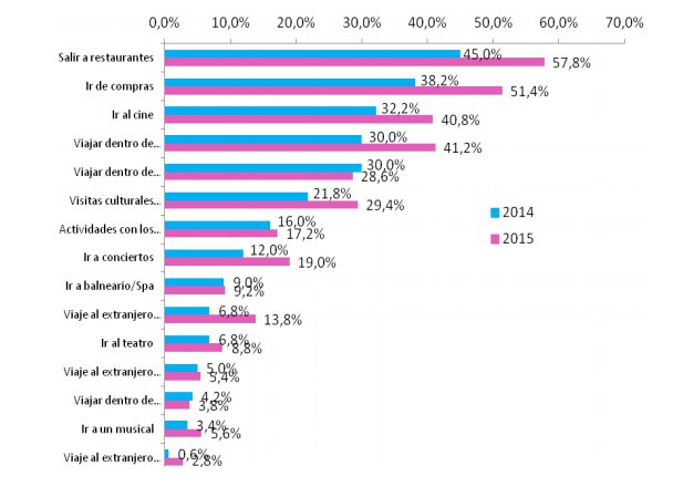 Por actividades, la iniciativa más realizada este verano ha sido ir a restaurantes (57,8%), seguida de ir de compras (51,4%) y viajar dentro de España alojándose en un apartamento (40,85), con un incremento medio por encima de los 11 puntos con respecto al verano pasado.