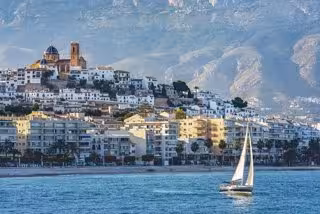 Pueblo de Altea, con el mar en el primer plano con un velero, el pueblo detrás y la iglesia de la villa - SEBASTIAN RAMIREZ MORALES