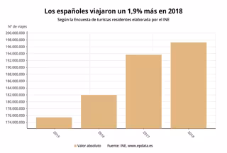 En el cuarto trimestre de 2018, los residentes en España realizaron 40,2 millones de viajes, lo que supone un aumento del 0,5% respecto al mismo periodo de 2017, con un gasto de 9.028 millones de euros, un 5% más. El 89,6% de los viajes en este periodo tuvo como destino principal el territorio nacional, un 0,9% en tasa anual. Por su parte, los viajes al extranjero, que representan el 10,4% del total, aumentaron un 14,4%.