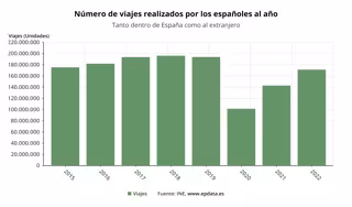Los viajes realizados por los residentes en España aumentaron un 19,9% en 2022 en comparación con 2021 y el gasto total efectuado en estos viajes se disparó un 54,6%, hasta los 50.292 millones de euros, según datos difundidos este martes por el Instituto Nacional de Estadística (INE).