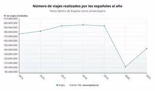 En concreto, los españoles realizaron 142,9 millones de viajes en 2021, mientras que las pernoctaciones asociadas a los mismos sumaron 626,1 millones, un 26,9% menos.