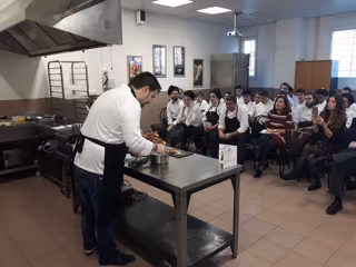 Los actos se han desarrollado en dos escuelas de hostelería, el primero de ellos en el IES Peñacastillo de Santander, a la que ha acudido medio centenar de futuros hosteleros, y la segunda en el IES Virgen de la Calle, Escuela de Hostelería y Turismo de Palencia, donde alrededor de 60 estudiantes se deleitaron con la clase magistral del Torrezno de Soria.