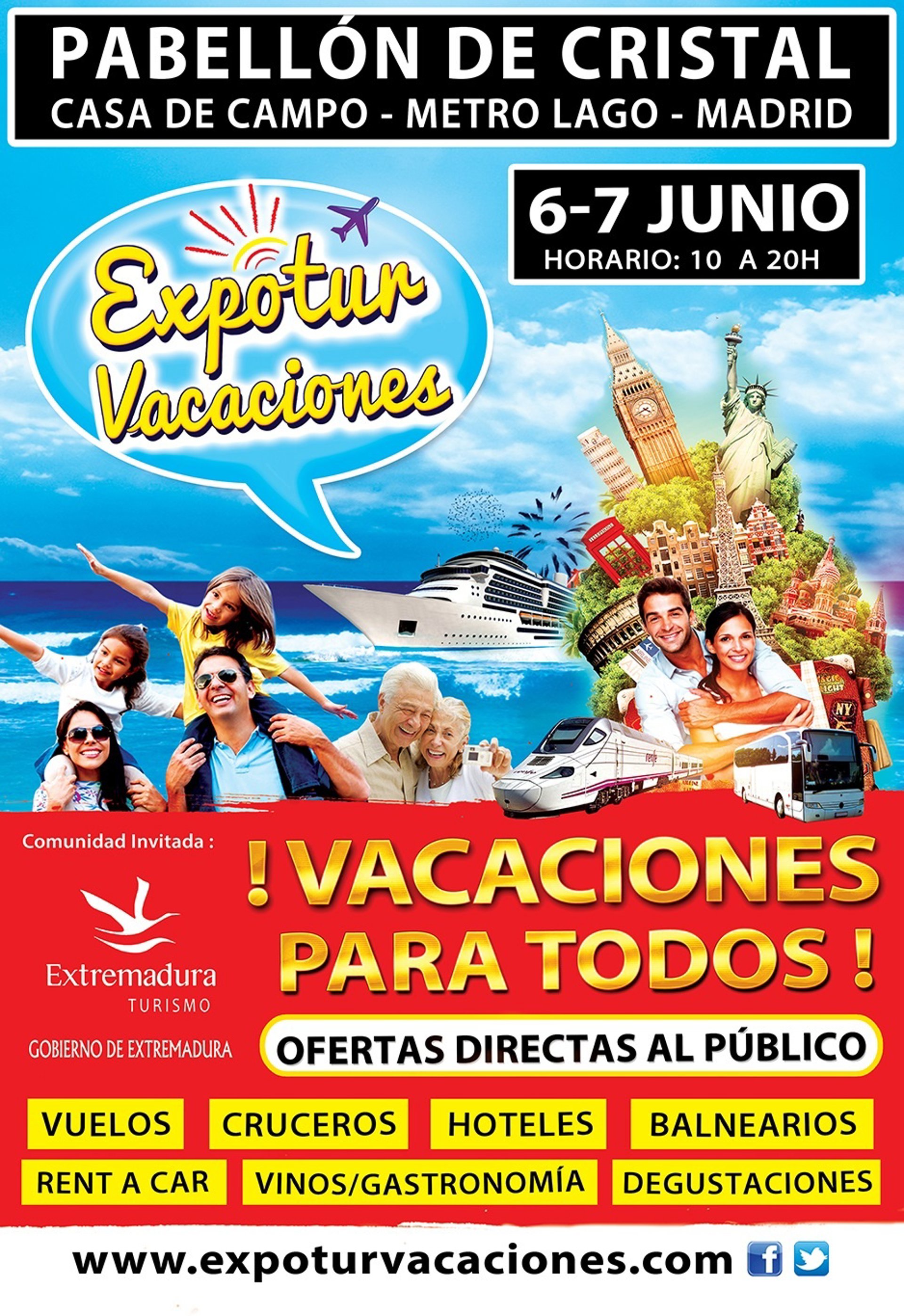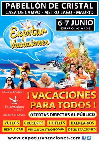 Los próximos días 6 y 7 de junio abre sus puertas en el pabellón de Cristal de la Casa de Campo de Madrid la primera feria Expotur Vacaciones, donde administraciones, touroperadores, agentes turísticos y empresarios ofrecerán productos y servicios turísticos al alcance de todos los bolsillos.