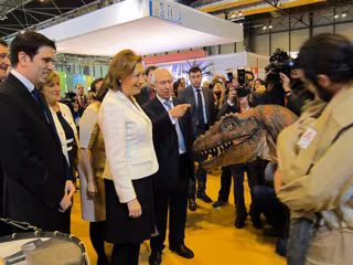 Antes de intervenir en el acto, la presidenta ha visitado el stand de la Comunidad, que tiene a la nieve, la gastronomía y a Dinópolis como ejes temáticos. Precisamente, uno de los primeros en recibirla a su llegada han sido los dinosaurios del expositor aragonés, que ya se han convertido en una de las atracciones turísticas de Fitur.