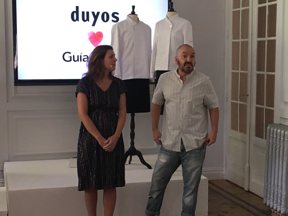 En una presentación en Madrid, la directora de Guía Repsol, María Ritter, y el diseñador Juan Duyos han mostrado las nuevas prendas que llevarán los cocineros personalizadas con sus nombres y el número de 'Soles' que la guía les haya concedido.