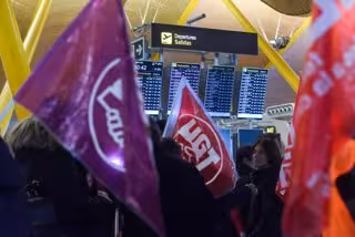 Manifestantes de UGT durante el último día de la huelga del servicio de handling de Iberia, en el aeropuerto Adolfo Suárez Madrid-Barajas. - Gustavo Valiente - Europa Press