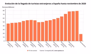 Ello se debe a que entre enero y noviembre visitaron España solo 18,3 millones de turistas internacionales, un 76,9% menos que en el mismo periodo de 2019.