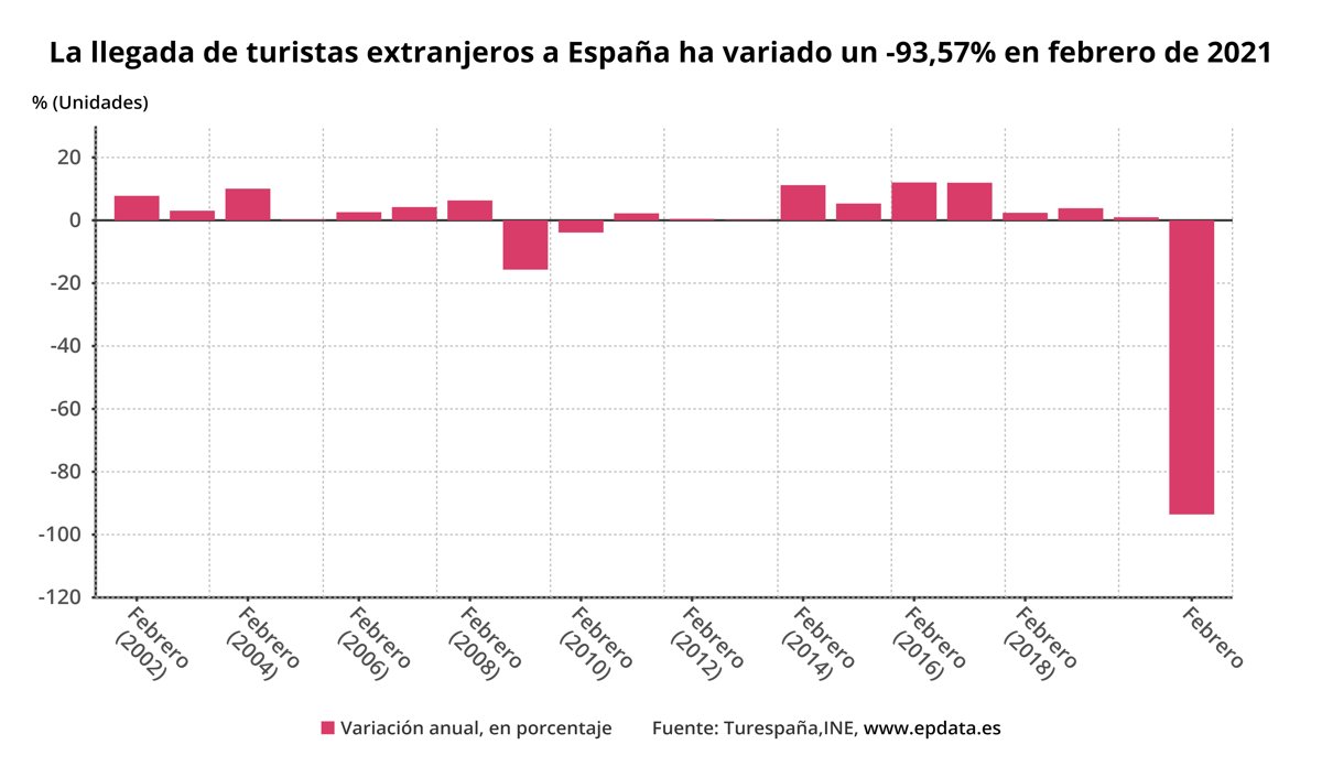 España recibió en febrero la visita de 284.311 turistas internacionales, un 93,6% menos que en el mismo mes de 2020, como consecuencia de la tercera ola de la pandemia, según datos publicados este martes por el Instituto Nacional de Estadística (INE).