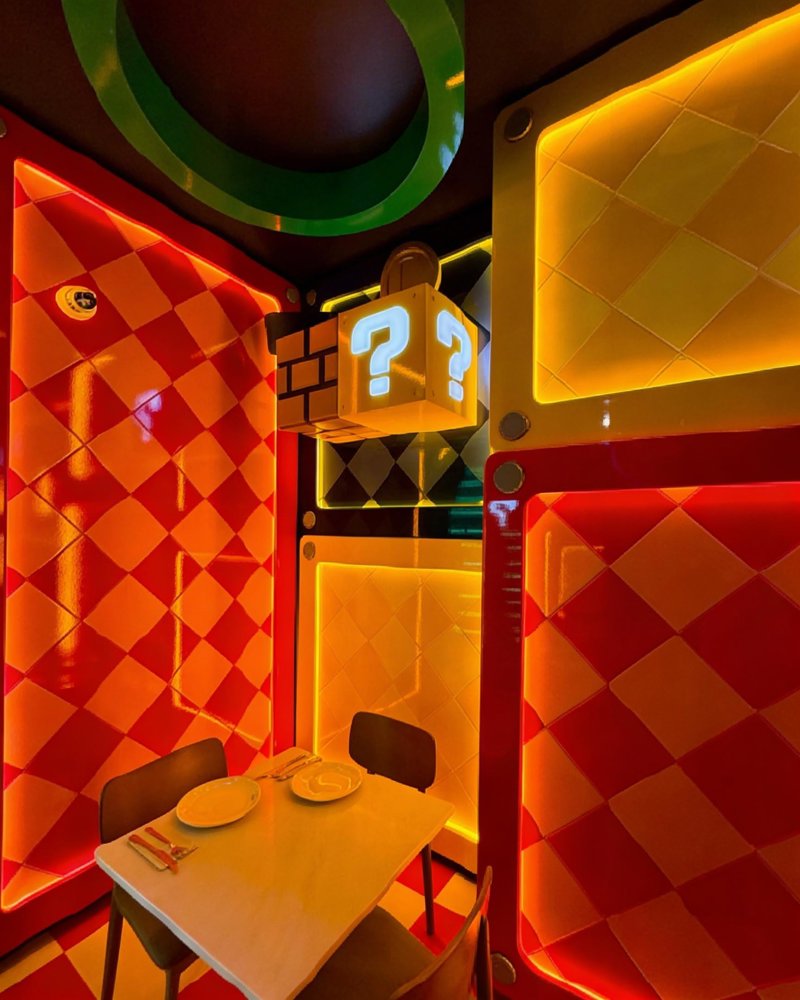 El local destaca por su cuidada estética pixelada y su ambientación envolvente, que transporta a los comensales a un mundo lleno de fantasía y aventuras. A través de distintas puertas, los visitantes acceden a salas temáticas repletas de guiños al videojuego: desde las clásicas cajas con interrogación que esconden monedas, a las setas gigantes en el techo o las inconfundibles Plantas Piraña, a los que se une una vidriera de la Princesa Peach. Todo está diseñado para que tanto adultos como niños se sumerjan en el universo del fontanero más famoso y del resto de personajes de la saga.