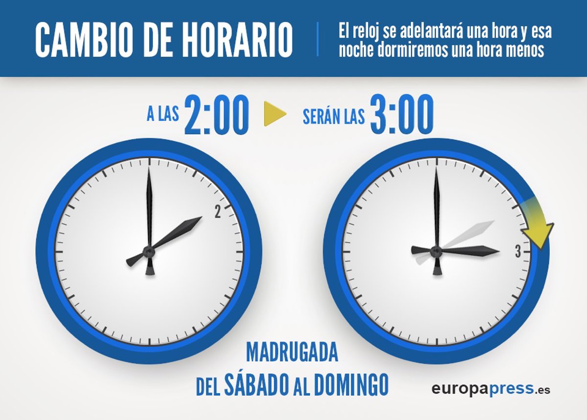 La madrugada del próximo domingo, 29 de marzo, a las 2.00 se adelantarán los relojes hasta las 03.00 y se dará comienzo así al horario de verano, que se prolongará hasta el último domingo de octubre cuando se recuperará el horario de invierno.