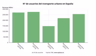 Los datos del INE muestran que el transporte urbano fue utilizado por más de 256,0 millones de viajeros en noviembre, un 16,6% más que en el mismo mes del año 2021.
