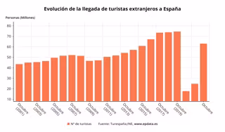 Según los datos del INE, en octubre cerca de 5,3 millones de turistas viajaron sin paquete turístico, lo que supone un aumento anual del 34%. Con paquete turístico llegan otros 1,9 millones, un 56,6% más.