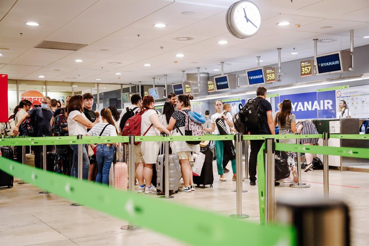 Pasajeros esperan en los mostradores de facturación de Ryanair, el día 1 de julio, en la Terminal 1 del Aeropuerto Adolfo Suárez Madrid Barajas, a 1 de julio de 2022, en Madrid (España). - CARLOS LUJÁN / EUROPA PRESS