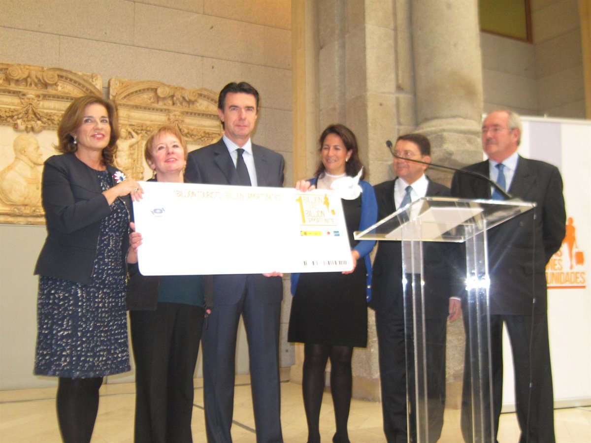 El secretario general de la OMT y el ministro de Industria, junto a la alcaldesa de Madrid, Ana Botella, y la secretaria de Estado de Turismo, Isabel Borrego, hicieron entrega del reconocimiento 'Turista mil millones" a Dale Floxp, una ciudadana británica que viajaba a España por segunda vez.