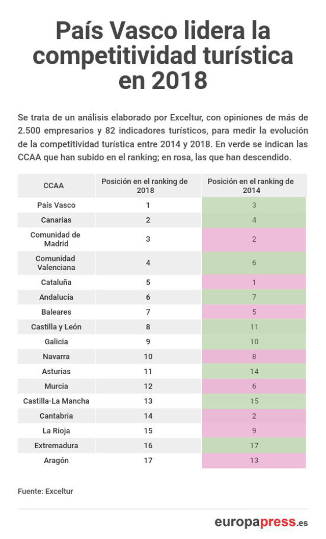 El País Vasco se situó a la cabeza en competitividad turística de España en 2018, según el informe Monitur presentado hoy en Madrid por la Alianza para la Excelencia Turística, Exceltur, que analiza la evolución en este aspecto de las CC.AA. y en el que destaca el descenso de comunidades como Madrid (3º posición), Cataluña (5ª) o Baleares (7ª), debido a la pérdida de prioridad política del sector turístico en estas regiones.