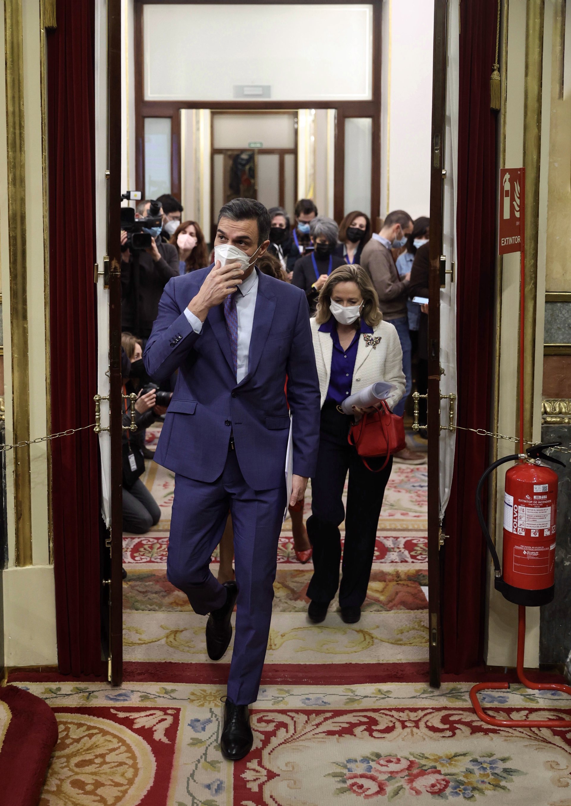 El presidente del Gobierno, Pedro Sánchez, y la vicepresidenta de Asuntos Económicos y Transformación Digital, Nadia Calviño, a su llegada a una sesión plenaria en el Congreso de los Diputados, a 23 de marzo de 2022, en Madrid (España). El pleno está ma - Eduardo Parra - Europa Press