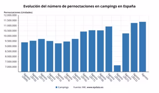 Los datos del INE muestran como las pernoctaciones en campings registraron en agosto un aumento del 1,2% respecto al mismo mes de 2022. Las de residentes suben un 0,3% y las de no residentes un 2,8%.