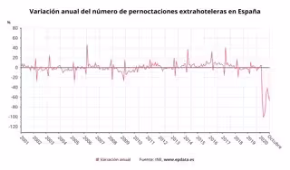 Variación anual del número de pernoctaciones extrahoteleras hasta octubre de 2020 - EPDATA