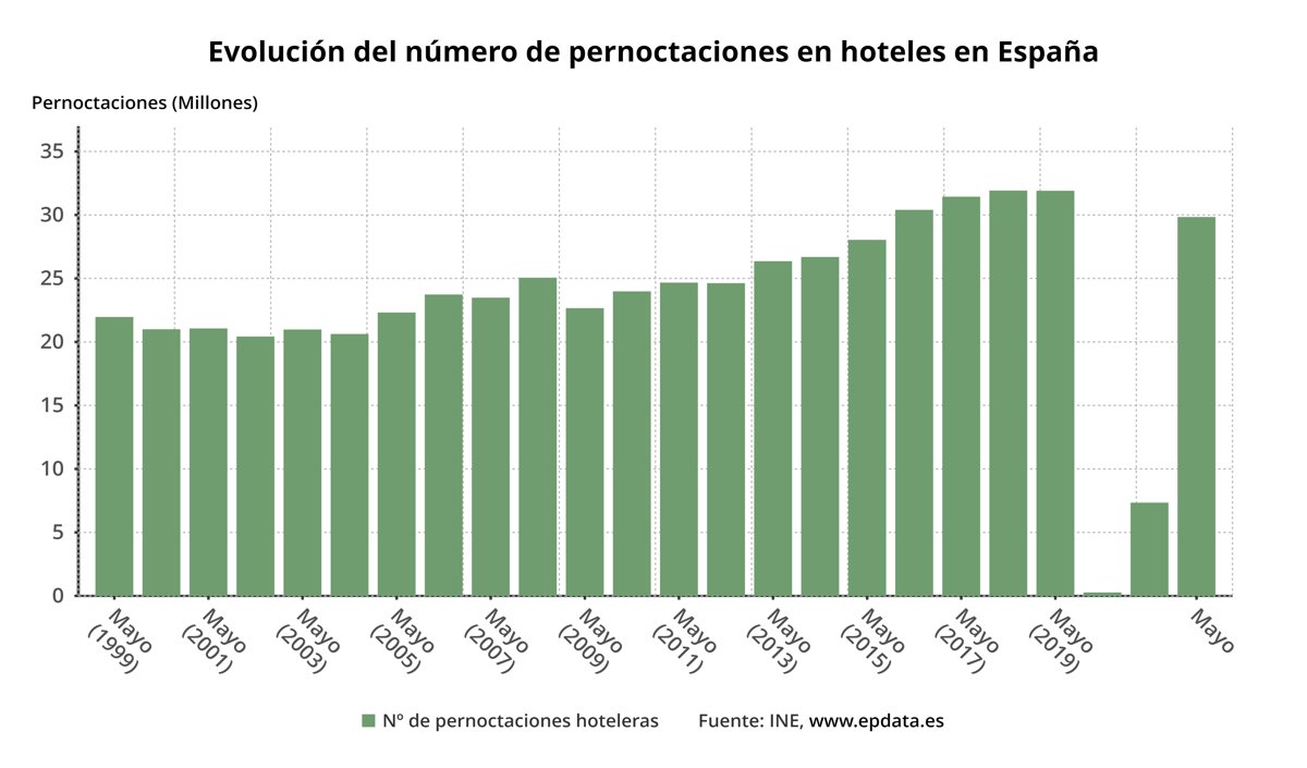 Pese a este fuerte repunte, las pernoctaciones registradas en mayo de este año por los hoteles españoles son aún inferiores a las que hubo en mayo de 2019, antes de la pandemia, cuando se registraron 31,9 millones de pernoctaciones.