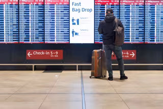 28 February 2024, Berlin: A passenger stands in front of a display board for departures in the hall of Terminal 1 at BER Airport. - Carsten Koall/dpa