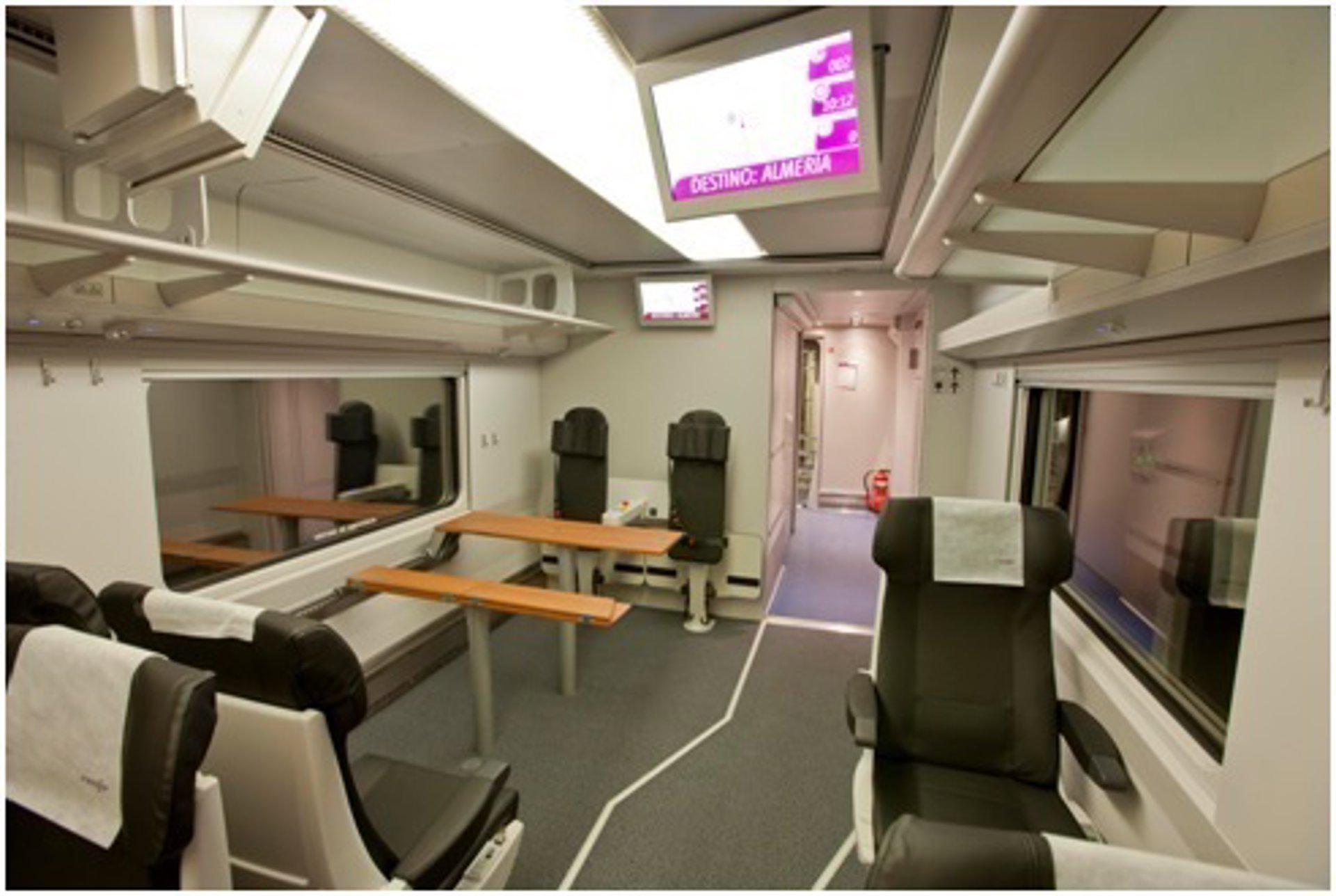 Las plazas cuentan con cinturones de seguridad, apoyos dorsales y cervicales, sistema antivuelco y mesa regulable en altura, según informó Renfe, además de un interfono que permite contactar con el personal de a bordo.