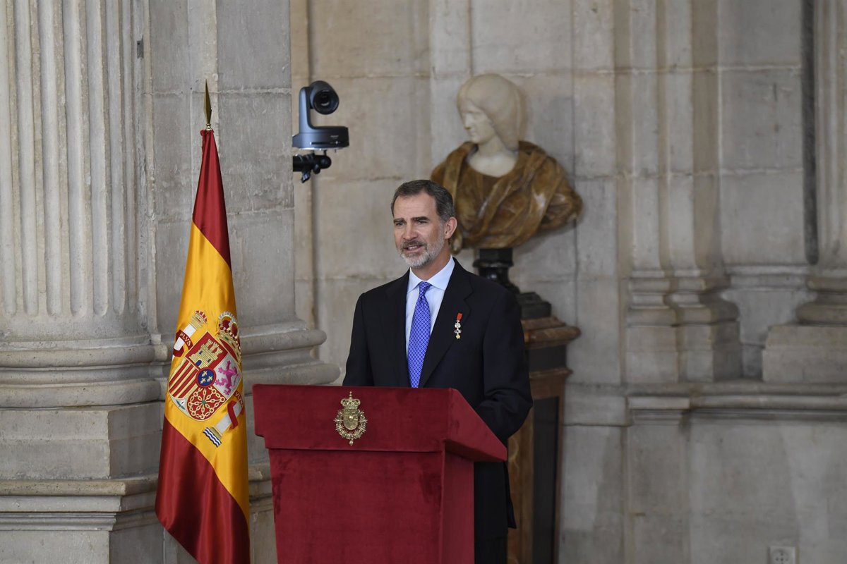 El Rey Felipe VI, durante su intervención en el acto de imposición de condecoraciones de la Orden del Mérito Civil en el Palacio Real. - Pool