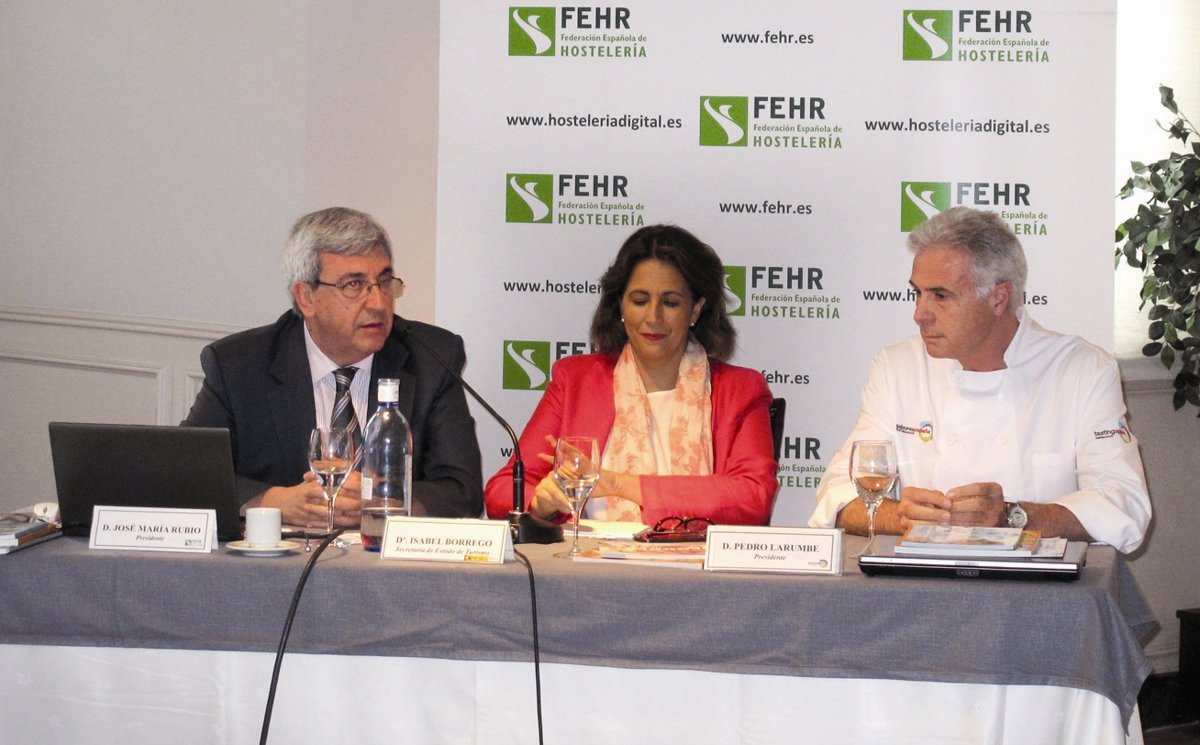 La secretaria de Estado de Turismo, Isabel Borrego, y el presidente de Saborea España, Pedro Larumbe, han materializado mediante su firma este acuerdo, en el marco de la celebración de la Asamblea General de la Federación Española de Hostelería, ante la presencia del presidente de FEHR y vicepresidente de Saborea España, José María Rubio.