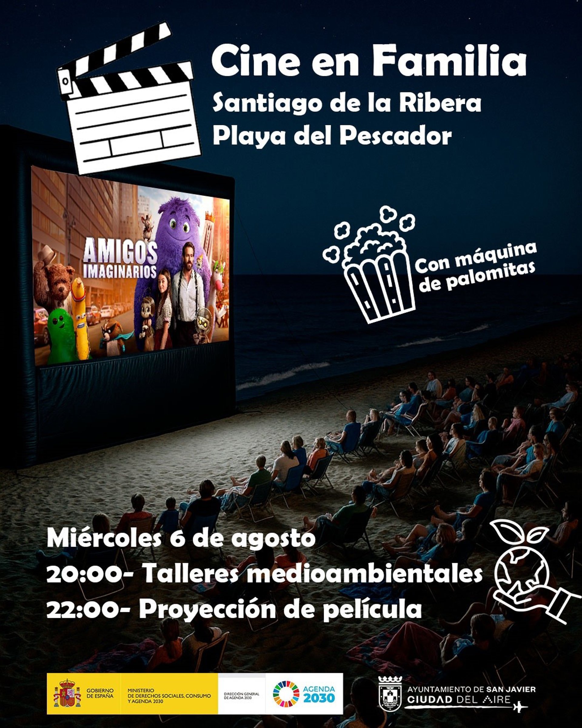 A partir de las 22.00 horas, bajo el cielo estrellado de San Javier, se proyectará la película 'Amigos Imaginarios', una historia entrañable para disfrutar en familia, compartir risas y vivir momentos inolvidables. Durante la proyección, los asistentes podrán disfrutar de palomitas gratis y del ambiente único que ofrecen nuestras playas al anochecer.
