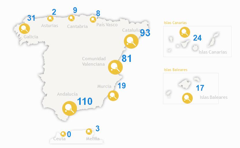Las comunidades más equipadas en este sentido son Andalucía, Cataluña y Comunidad Valenciana, las cuales suponen cerca del 75% de las playas con este tipo de instalaciones.