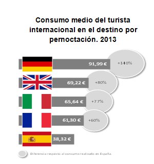 Y es que los turistas internacionales consumen 38,32 euros por pernoctación en España, un 47% menos que la media en el resto de países vecinos. Así, estos mismos visitantes gastan 91,99 euros de media por noche en Alemania o los 69,22 euros de Reino Unido.