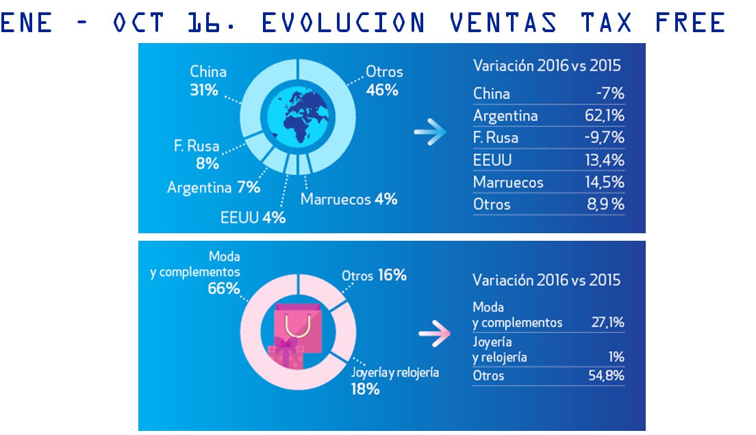 Con un 66% de las ventas 'tax free', la moda y los complementos fueron los productos más adquiridos hasta octubre, seguidos por joyería y relojería, con el 18%. El 16% restante fue a parar a otros tipos de productos.