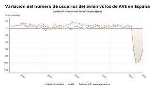Variación anual del número de usuarios de avión frente a los de AVE en España hasta julio de 2020 (INE) - EPDATA