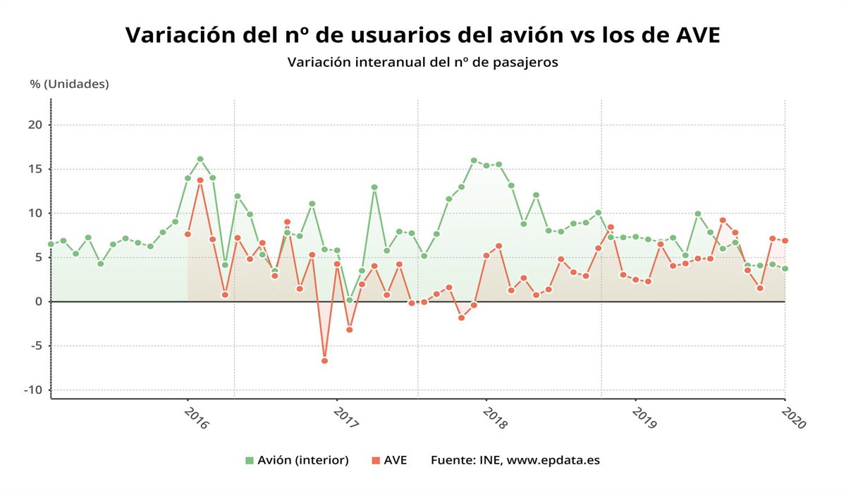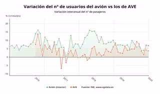 El número de viajeros que optó por viajar en avión para desplazarse por el interior del país aumentó un 3,8% en enero respecto al mismo mes del año anterior, mientras que los que eligieron los trenes AVE subieron un 6,9%, según datos del Instituto Nacional de Estadística (INE) hechos público este miércoles.