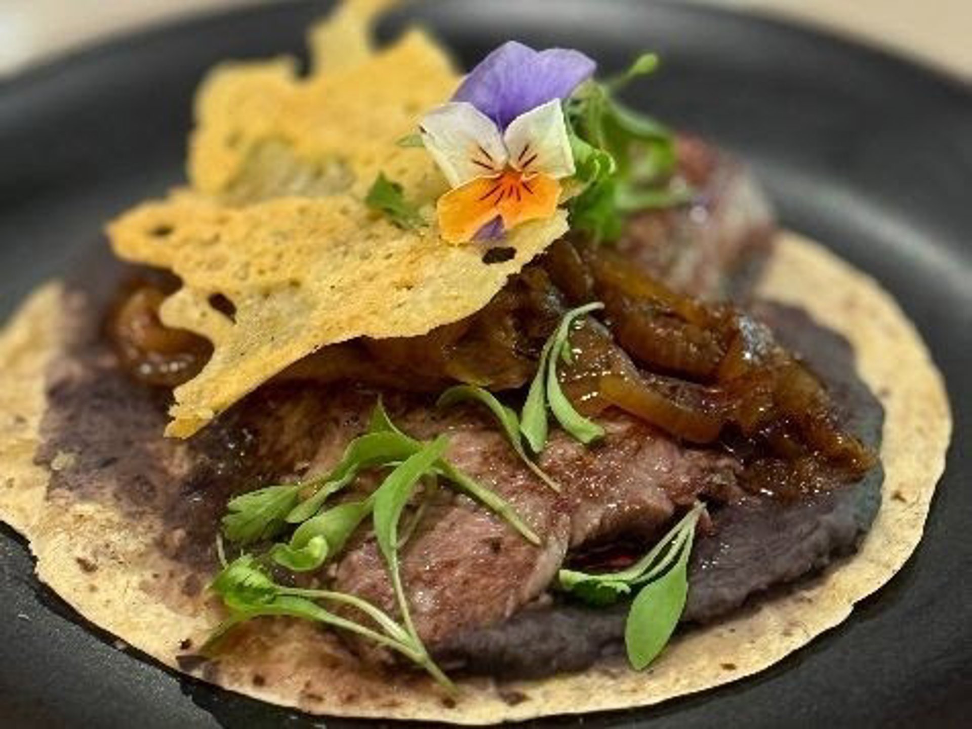 Este plato combina solomillo tierno, frijoles refritos, cebolla caramelizada, costra de queso gratinado, brotes de cilantro y una flor comestible como toque decorativo. Se trata de una creación sin picante, pensada para atraer a un público amplio sin renunciar a la riqueza de sabores.