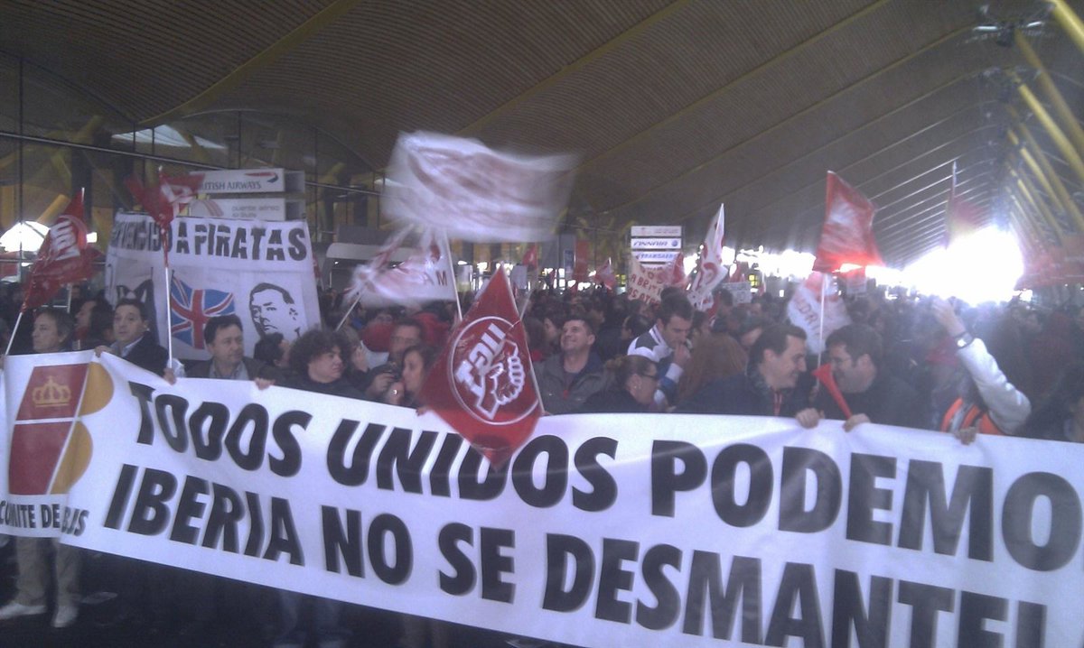 Unos 2.000 trabajadores de Iberia han recorrido este viernes a mediodía las instalaciones de la T4 del aeropuerto de Madrid-Barajas, en protesta por el plan de reestructuración de la compañía, que implica 4.500 despidos, portando banderas y con una gran pancarta encabezando la protesta donde podía leerse 'Todos unidos podemos Iberia no se desmantela'.