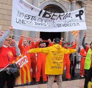 Unos 300 trabajadores de Iberia se han manifestado este miércoles en la plaza Sant Jaume, delante del la sede de la Generalitat de Catalunya, para mostrar su rechazo ante el ERE que la compañía aérea prevé llevar a cabo para despedir a 3.807 empleados.