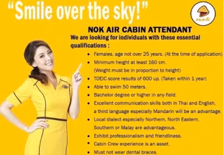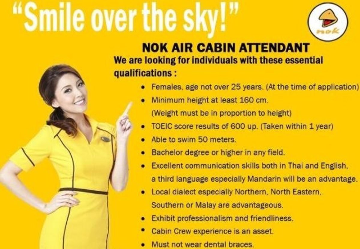 La aerolínea tailandesa Nok Air está buscando azafatas y entre sus particulares requerimientos exige a las candidatas tener una altura y peso "proporcionado" o no usar ortodoncia, además de ser menor de 25 años en el momento en el que se realice el proceso de selección.