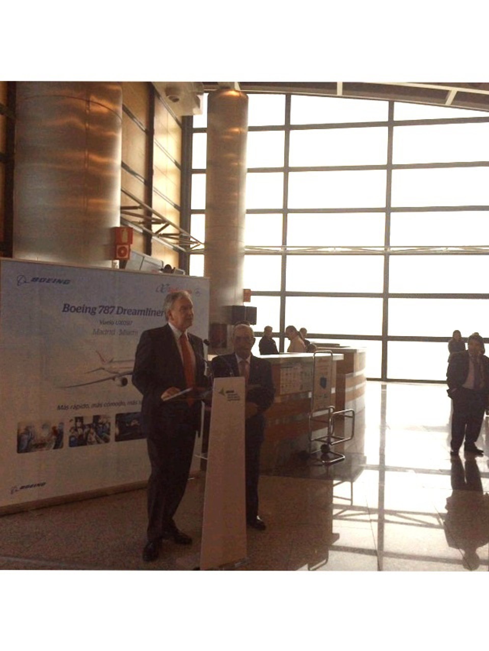 Al acto simbólico del corte de cinta celebrado este mediodía en el aeropuerto Adolfo Suárez Madrid-Barajas, ha asistido el presidente de la compañía, Juan José Hidalgo y el director del Centro Europeo de I+D de Boeing, José Enrique Román.