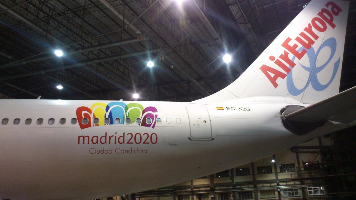 El avión, un Airbús 330-200 pintado con los colores de la candidatura, ha sido puesto a disposición de la candidatura olímpica por Air Europa. Además las servilletas, cabezales o fundas de almohada llevarán bordado el anagrama de Madrid 2020.