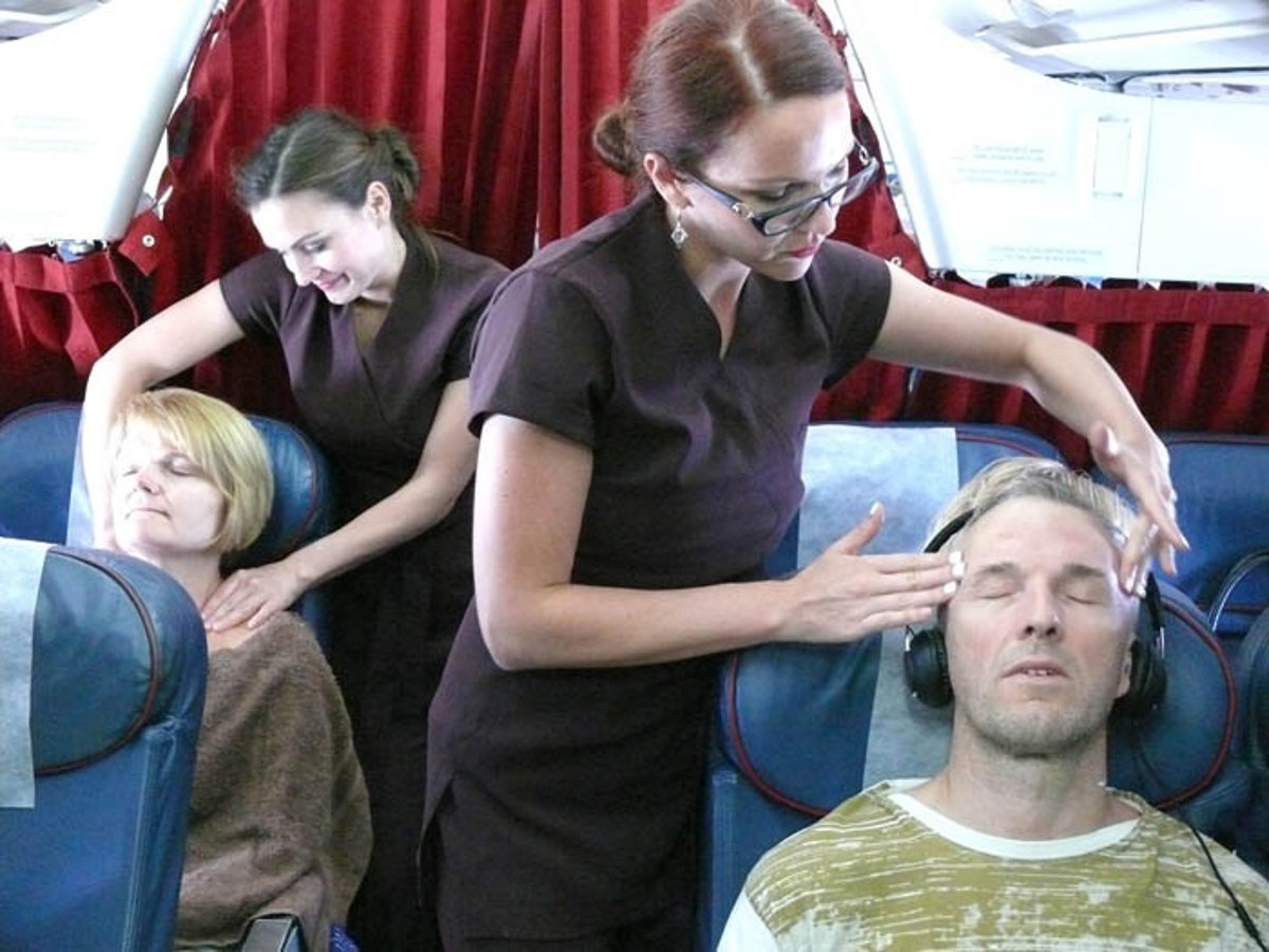 Dos terapeutas profesionales se encargaron de dar la bienvenida a los pasajeros con distintos productos de belleza y con tratamientos de lujo como masajes de manos, pies y cuello mientras escuchaban música relajante.