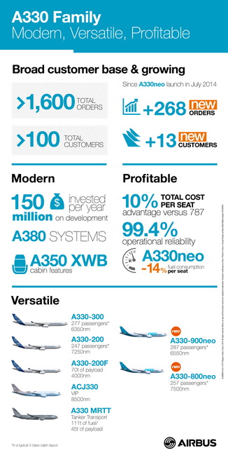 Airbus Group ha anunciado que aumentará su tasa de producción del A330 a siete aviones al mes para 2017 gracias al éxito comercial que ha mantenido este modelo en 2015, que solo el año pasado acumuló más de 80 pedidos para este modelo.