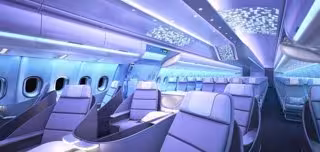 La nueva cabina, inspirada en la del nuevo A350 XWB, incluye la última tecnología de iluminación LED y es más amplia y moderna que las cabinas convencionales permitiendo a los pasajeros disfrutar de un espacio mayor.