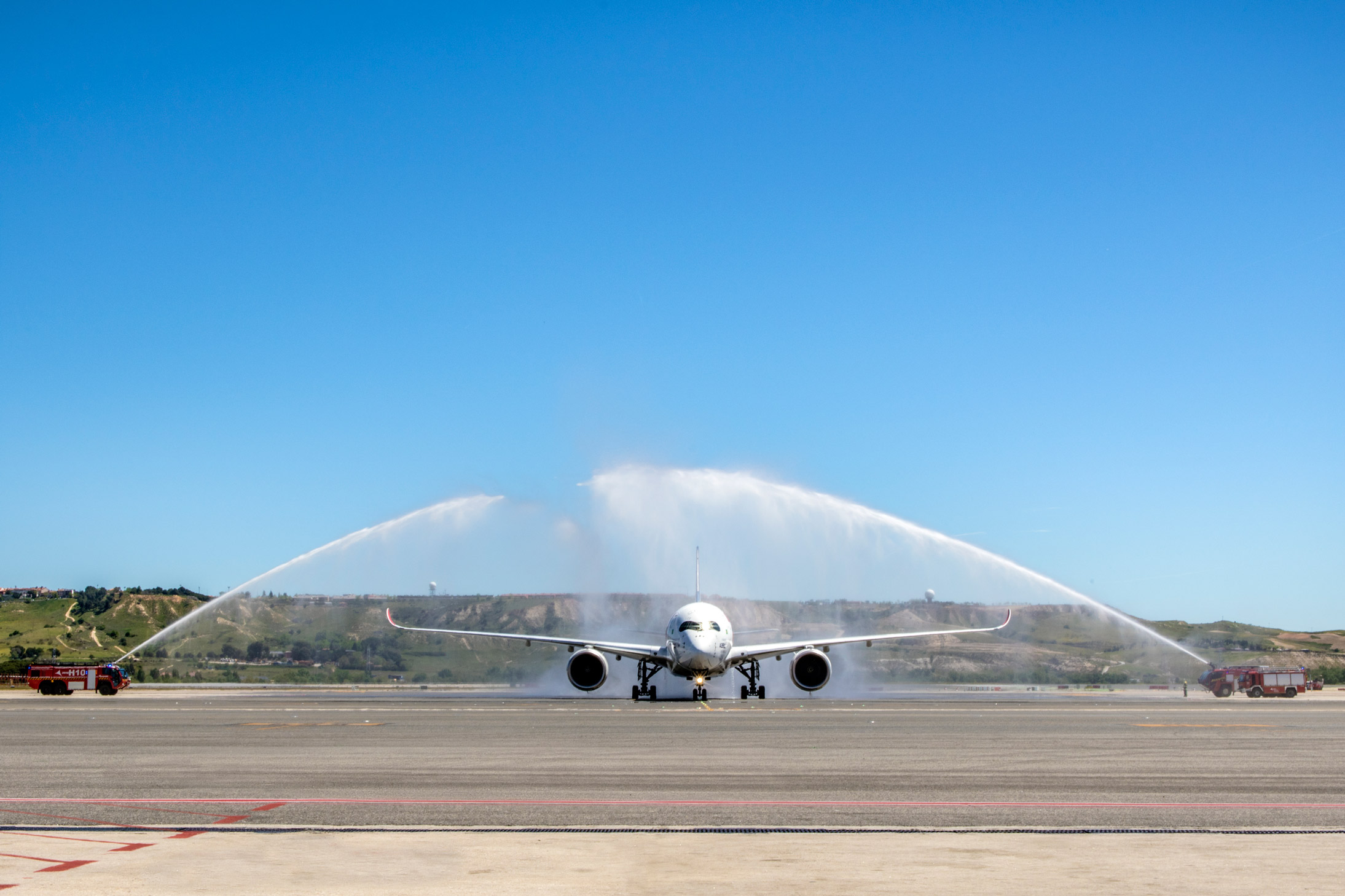 El primer A350XWB que cruza el Atlántico aterrizó ayer en Madrid en el aeropuerto Adolfo Suárez Madrid-Barajas de la mano LATAM Airlines Group, en un vuelo que cubrió la ruta de Sao Paulo-Madrid, y que fue recibido en la pista de aterrizaje por el tradicional arco de agua.