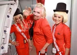 El dueño de Virgin, Richard Branson, se subió a los tacones el pasado domingo para servir como azafata en un vuelo de una de sus competidoras, Air Asia, entre Perth y Kuala Lumpur, tras perder una apuesta con el propietario de dicha compañía aérea.
