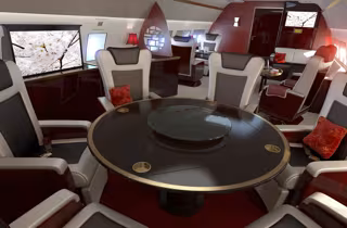 La cabina más amplia de los aviones corporativos Airbus permite la instalación de una mesa redonda convertible en cuadrada, un modelo muy popular en culturas como la china, utilizado tanto para reuniones como para juegos como el Mah Jong.