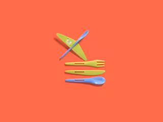 El set de cubiertos, de plástico reciclable, está inspirado en la forma aerodinámica de los aviones y el cuchillo de plástico, tenedor, cuchara y un par de alas encajan juntos como un avión.