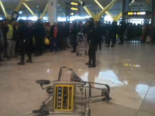 La Policía había bloqueado el acceso a los huelguistas al interior de la terminal con un amplio dispositivo de furgones y cinco agentes por puerta, sin embargo la tensión entre los manifestantes, que portaban pancartas y proliferaban gritos como 'Vamos a entrar', 'Manos arriba esto es un atraco', ha ido en aumento y los manifestantes han intentado acceder al interior.