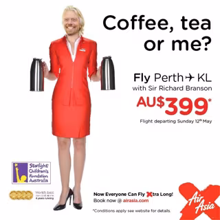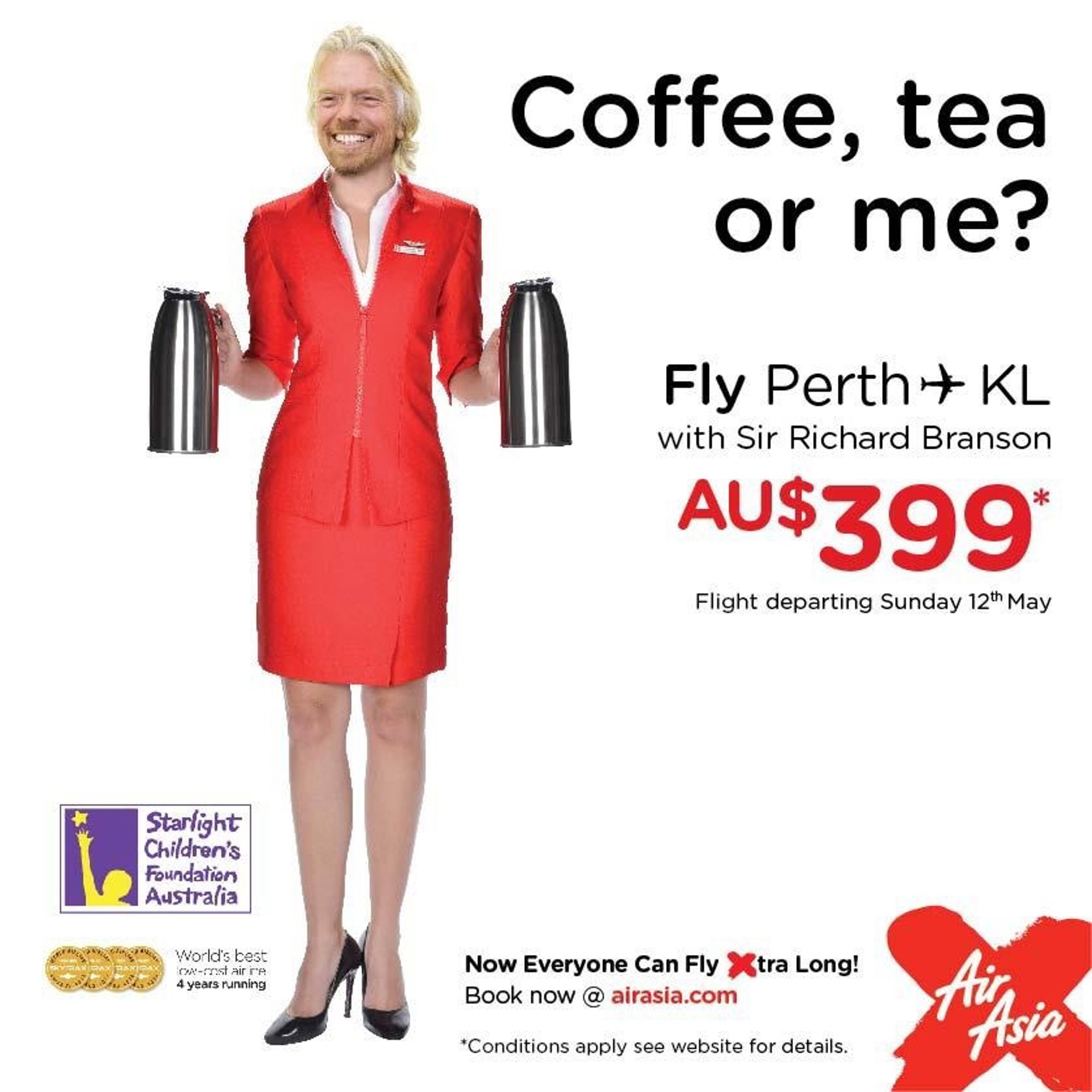 El propietario de Virgin Atlantic, Richard Branson, servirá champán como azafata en un vuelo el próximo 12 de mayo entre Perth y Kuala Lumpur de la aerolínea rival Air Asia X tras perder una apuesta con el dueño de dicha compañía aérea, según ha informado la compañía aérea a través de las redes sociales.