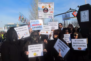 Mientras el presidente de IAG y presidente del comité de Fitur, Antonio Vázquez, acompañaba a los Príncipes de Asturias en su itinerario de bienvenida a la feria, empleados de la aerolínea española se citaban al otro lado del recinto ferial para "salvar a la compañía y al turismo", según la plataforma.